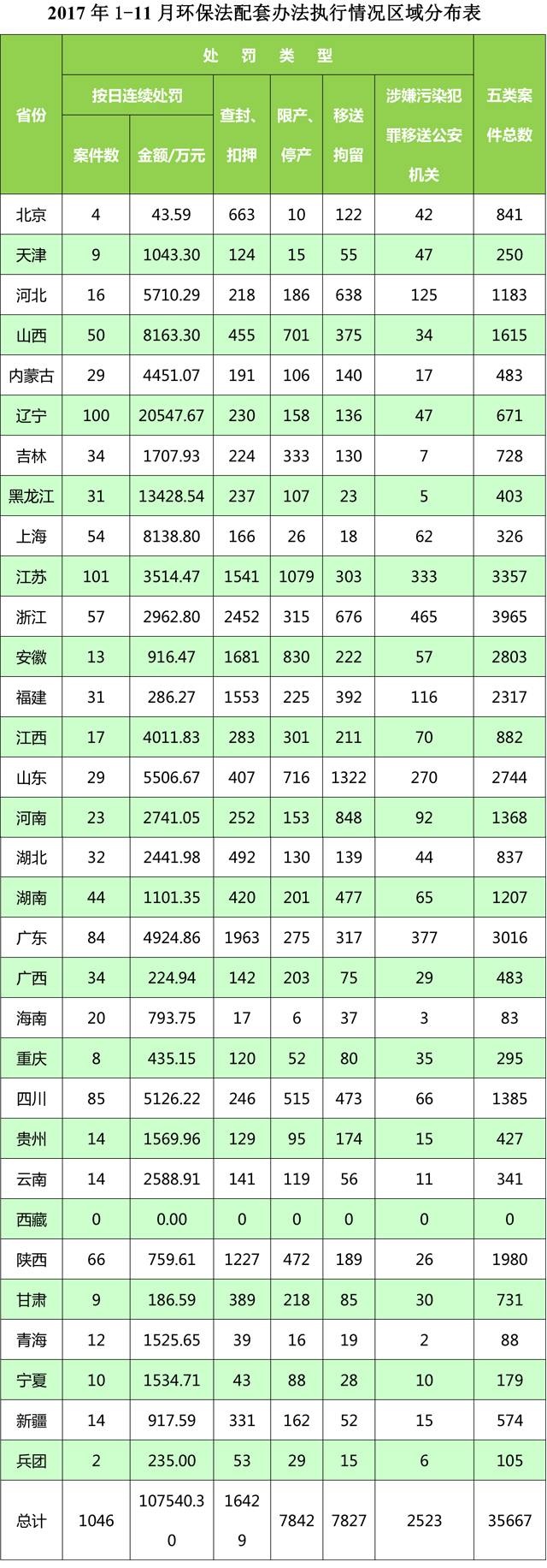 1-11月,全國實施五類案件總數35667件。同比去年1-11月增長102.4%。其中,按日連續處罰案件1046件,比去年同期增長31.1%。罰款金額達107540.30萬元,比去年同期增長43.4%;查封、扣押案件16429件,比去年同期增長121.6%;限產、停產案件7842件,比去年同期增長77.8%;移送行政拘留7827起,比去年同期增長139.1%;移送涉嫌環境污染犯罪案件2523件,比去年同期增長46.3%