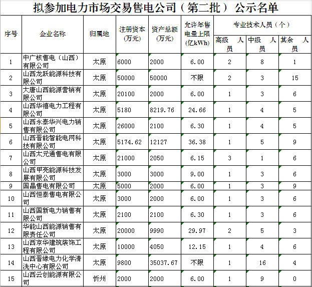 中科宇杰:關于山西省第二批參加電力市場交易售電公司名單