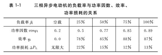 三相異步電動(dòng)機(jī)的負(fù)載率與功率因數(shù)、效率、功率損耗的關(guān)系見表1-1。
