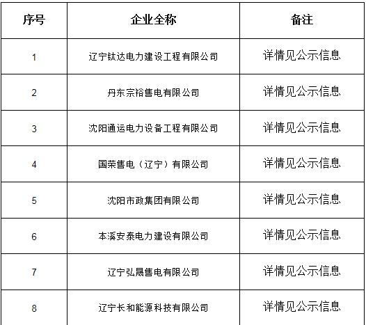 公示期間,任何單位和個人如有異議,可以實名通過來電、來信、來訪等方式向遼寧電力交易中心反映。本次公示售電公司目錄如下: