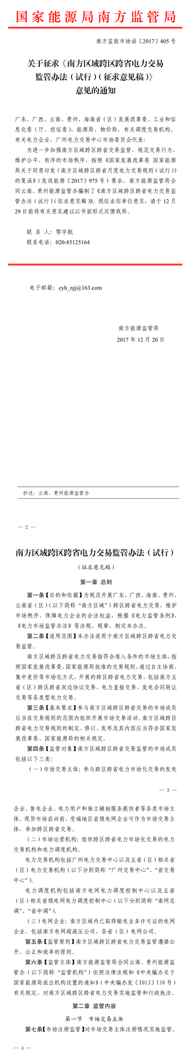 近日,國家能源局南方監管局日前發布了《關于征求南方區域跨區跨省電力交易監管辦法(試行)(征求意見稿)意見的通知》,辦法適用于南方區域(廣東、廣西、海南、云南、貴州)跨區跨省電力交易監管。在征求意見期間,有意見可以反饋到國家能源局南方監管局,截止日期為12月29日。