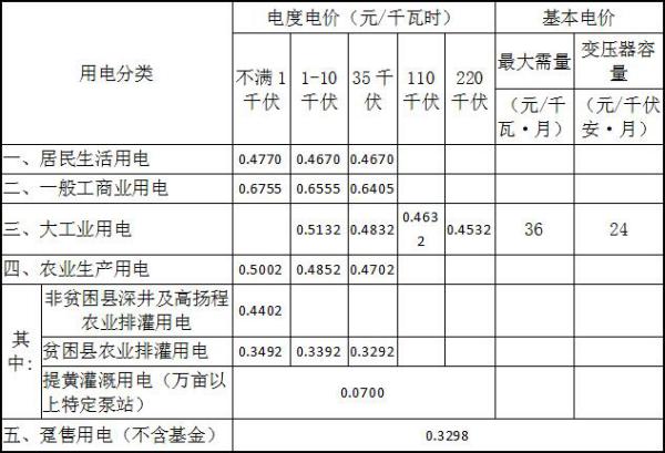 注:1、上表所列價格,除貧困縣農業排灌用電、躉售用電外,均含國家重大水利工程建設基金0.7分錢。