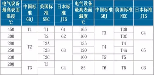 中、美、日爆炸性氣體溫度組別對照