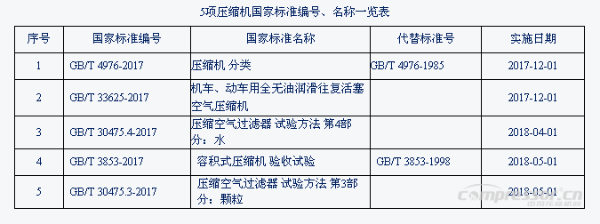 2017年第11號、第23號、第29號中華人民共和國國家標準公告,由國家質量監(jiān)督檢驗檢疫總局、國家標準化管理委員會批準發(fā)布了共5項壓縮機國家標準,具體內容見表:
