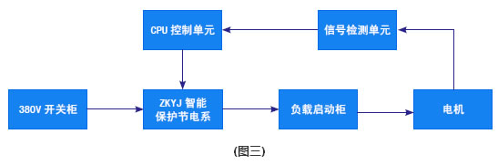 由圖三所示,在低壓380V開關柜與負載(風機水泵空壓機、及電機拖動類)啟動柜之間串接智能保護節電系統,系統在電機的使用上,它能自動跟蹤檢測電機運行中的負載變化,將檢測信號反饋給控制中心,經過中央處理,運算放大后給出指令信號,以此來改變有功電量的輸出,使電機在最經濟的電耗下運行,達到節電的目的。
